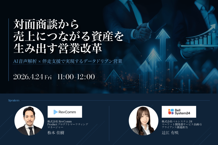 2026年4月24日(金)開催、ベルシステム24×RevComm共催セミナー「対面商談から”売り上げ”につながる資産を生み出す営業改革」にプロダクトマーケティングマネージャー 松本 佳樹が登壇します。