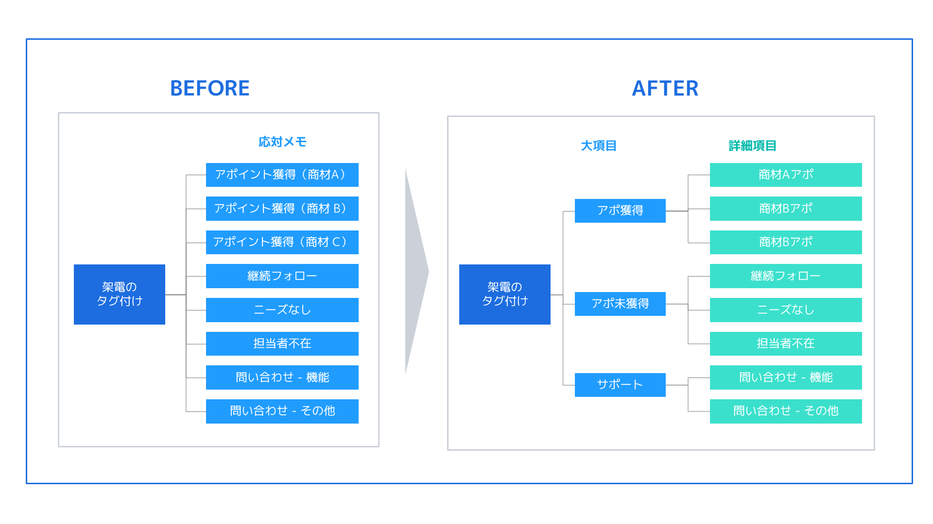 このたび、お客様からの「部門ごとに階層を分けて応対メモを管理したい」「問い合わせのカテゴリ、架電結果など複数の階層でタグ付けしたい」という声に応えるために、これまで1階層のみだった「応対メモ」を「大項目」「詳細階層」の2階層に拡充しました。