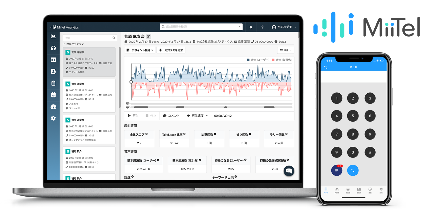 音声解析AI電話「MiiTel」は、インサイドセールス市場を中心に、営業やコールセンター業務におけるトークの可視化とセルフコーチング、リモートワーク体制構築にご活用いただいています。また、オンライン商談ツール「MiiTel Live」は、複数人でのオンライン商談の解析や振り返りが可能となり、営業の成約率を飛躍させます。