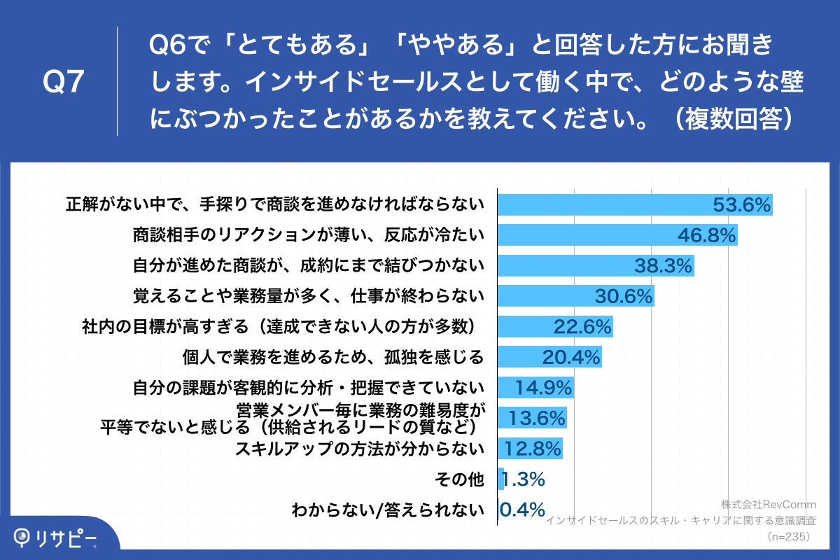 一方で、現役インサイドセールスの77.8%が、働くうえで壁にぶつかった経験があり、半数以上が「正解がない中で、手探りで商談を進めなければならない」という壁にぶつかった実態が明らかになりました。そこで、壁を乗り越えた方法を伺うと、「量をこなして傾向と対策のデータを構築した」や「何度もチャレンジしたり、成功者の好事例を真似てみた」などトライアンドエラーを繰り返した経験談が語られました。