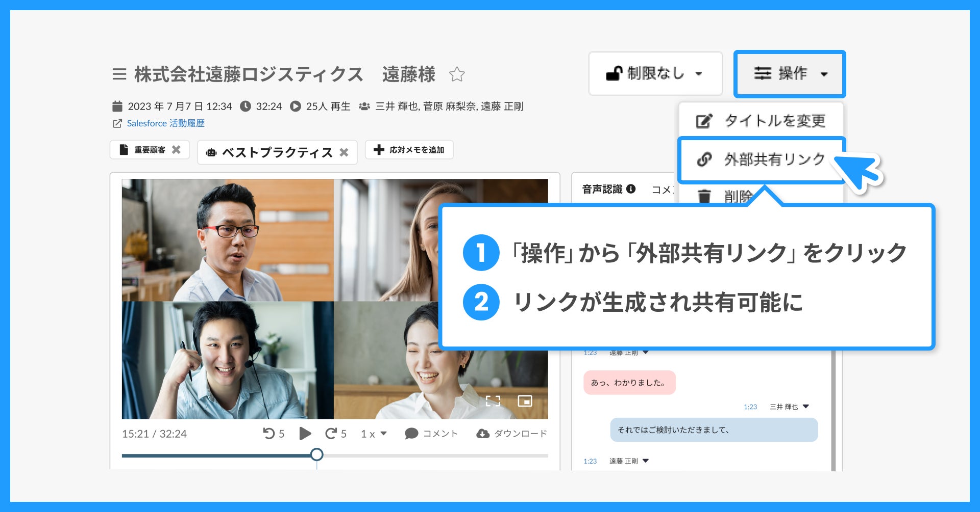 外部共有機能では、お客様に会議履歴を閲覧できる外部共有リンクを即座に発行することができます。お客様と会議を行った場合に、会議の録画や音声認識結果をお客様にも確認いただくことで、会議内容を認識の齟齬なく振り返ることができるようになります。
