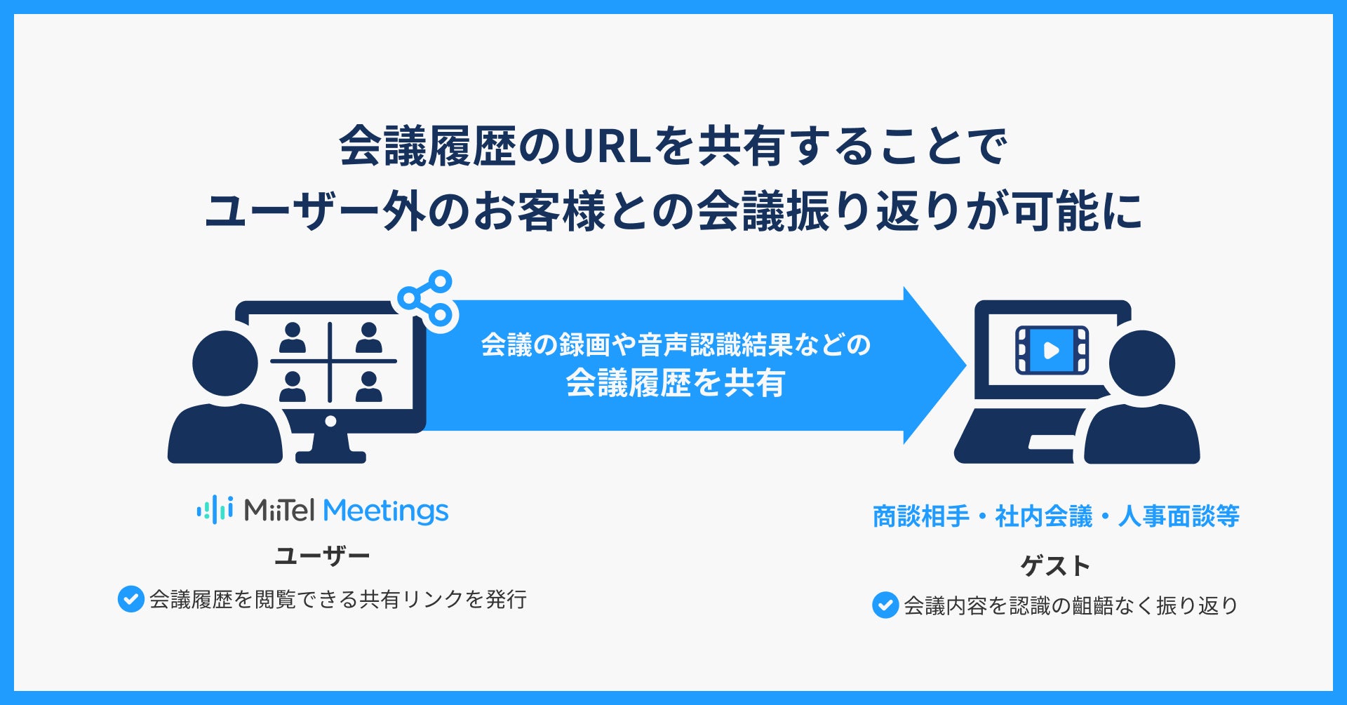 「MiiTel Meetings」は、このたびの外部共有機能追加により商談の場での活用に加え、お客様との「言った言わない」問題が起こりやすいカスタマーコミュニケーションの場、さらには社内会議や人事面談といった社内コミュニケーションの場でも利便性高く活用できるようになり、あらゆる場面で発生するコミュニケーションを円滑に進めることができるようになります。