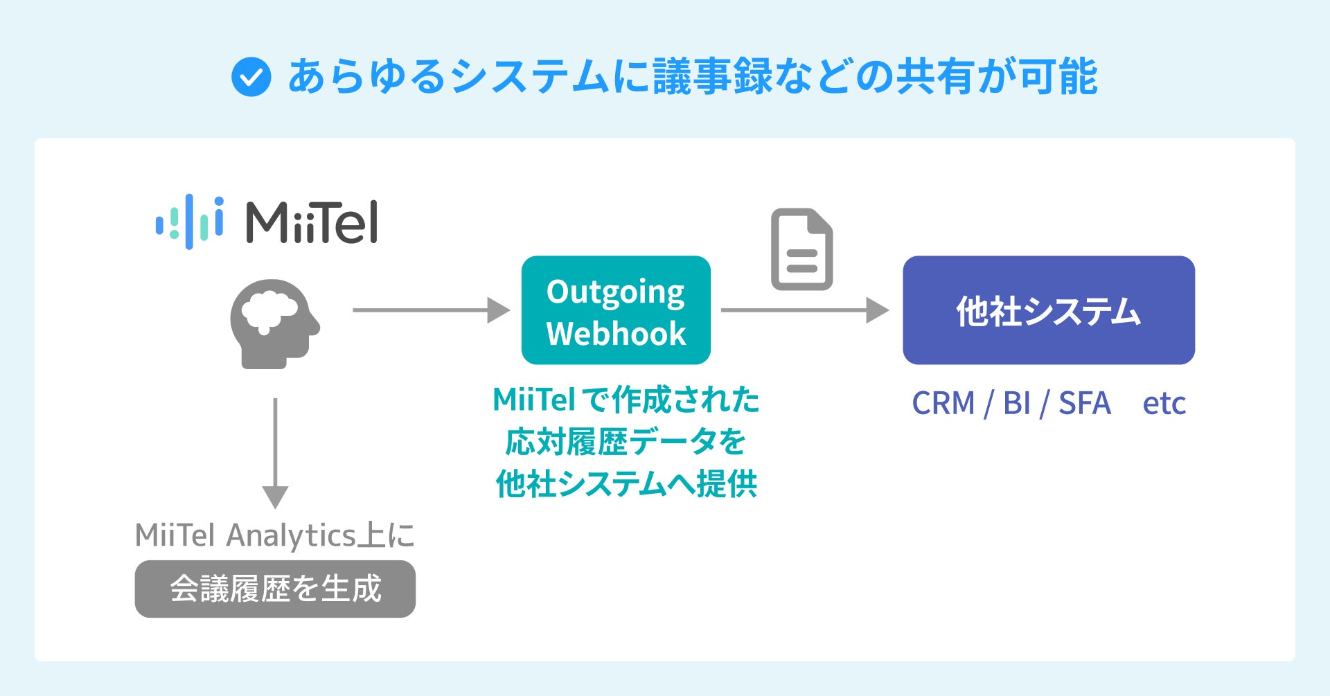 MiiTel Analyticsで分析を行ったデータは、Outgoing Webhook機能を利用し、任意のCRM(顧客関係管理)、BI(ビジネスインテリジェンス)、SFA(営業支援)システムなどにデータ連携することができます。MiiTelの活用により、すべての音声コミュニケーションを集約し、膨大なデータから意味のある示唆を抽出することで、これまで以上に戦略的意思決定やユーザーの成長を支援します。