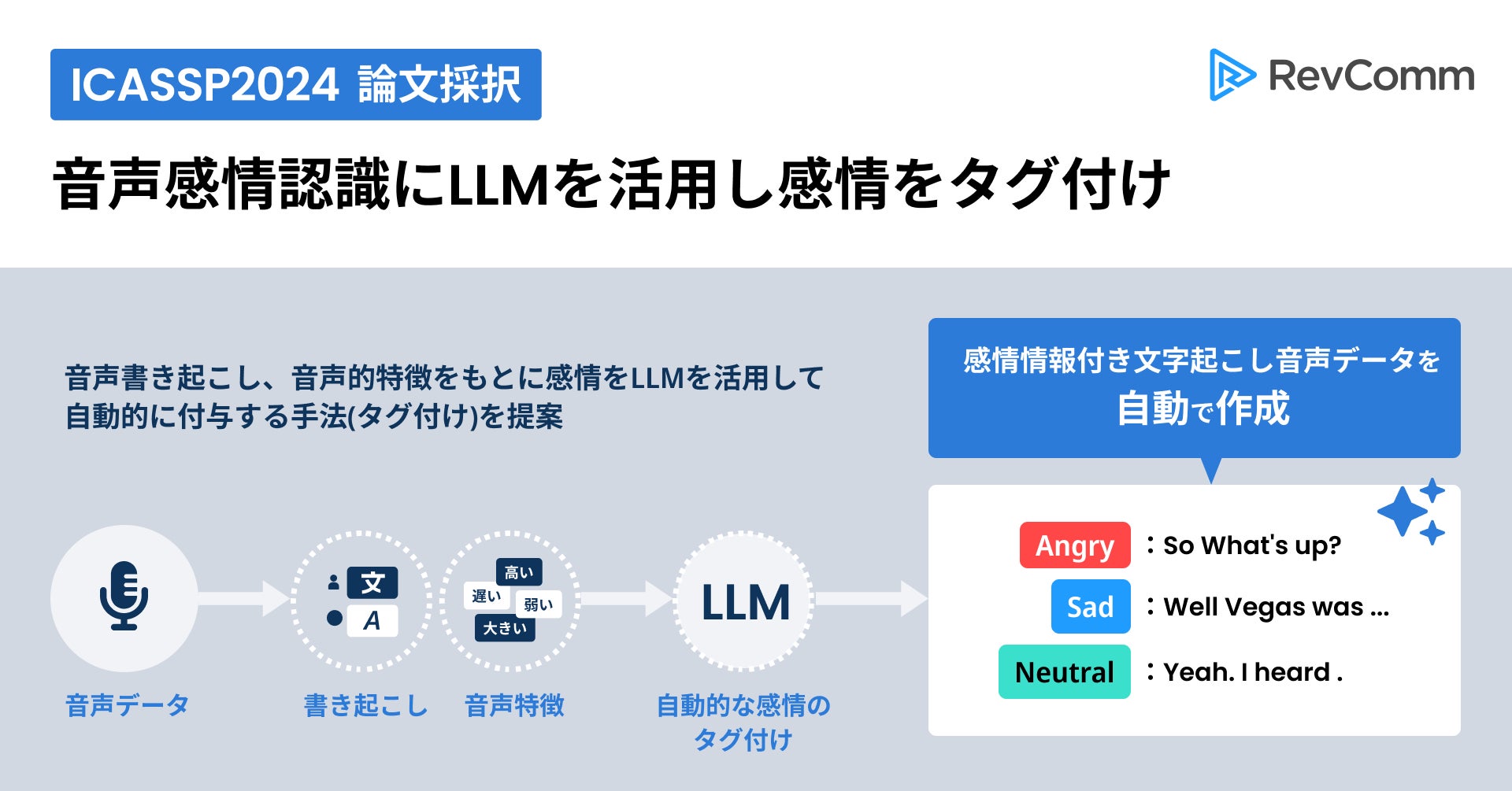 株式会社RevComm(レブコム、本社:東京都渋谷区、代表取締役:會田武史)の研究開発組織、RevComm Research(レブコム・リサーチ、RCR)による「大規模言語モデルを活用した音声への感情のアノテーション」に関する論文が、2024年4月14日から19日に開催される、音声・音響信号処理における世界最大規模の国際学会「ICASSP 2024」(ソウル、韓国)にて採択されました。