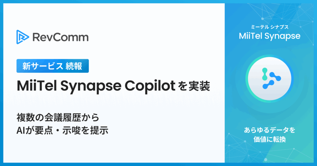 株式会社RevComm(レブコム、本社:東京都渋谷区、代表取締役:会田武史)は、7月に発表した「MiiTel Synapse Copilot(ミーテル・シナプス・コパイロット)」を実装しました。これにより、Web会議解析AI「MiiTel Meetings(ミーテルミーティング)」、対面会話解析AI「MiiTel RecPod(ミーテルレックポッド)」の複数の会議履歴からAIが即座に担当者や管理者に要点・示唆を提示します。