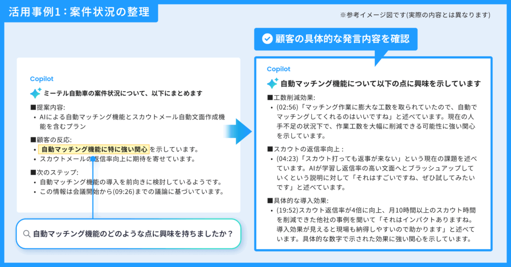 さらに、チャットで詳細を質問できるため、顧客が話した内容を正確に確認できます。これにより、やるべきことの抜け漏れを防ぎ、商談をスムーズに進められます。