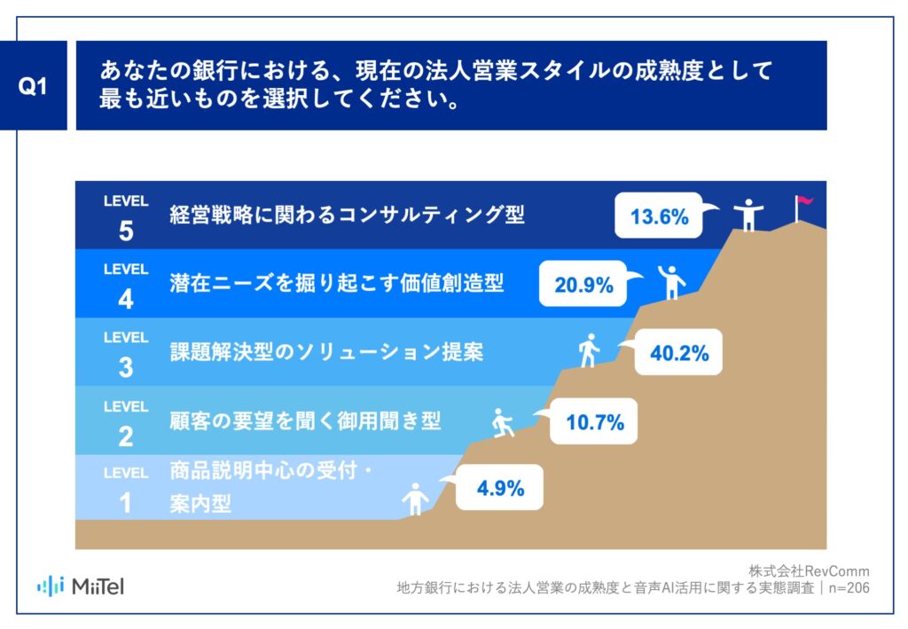 音声解析AI「MiiTel(ミーテル)」を提供している株式会社RevComm(レブコム、本社:東京都渋谷区、代表取締役:会田武史)は、地方銀行の法人営業部門の担当者 206名を対象に、地方銀行における法人営業の成熟度と音声AI活用に関する実態調査を実施しましたので、お知らせいたします。