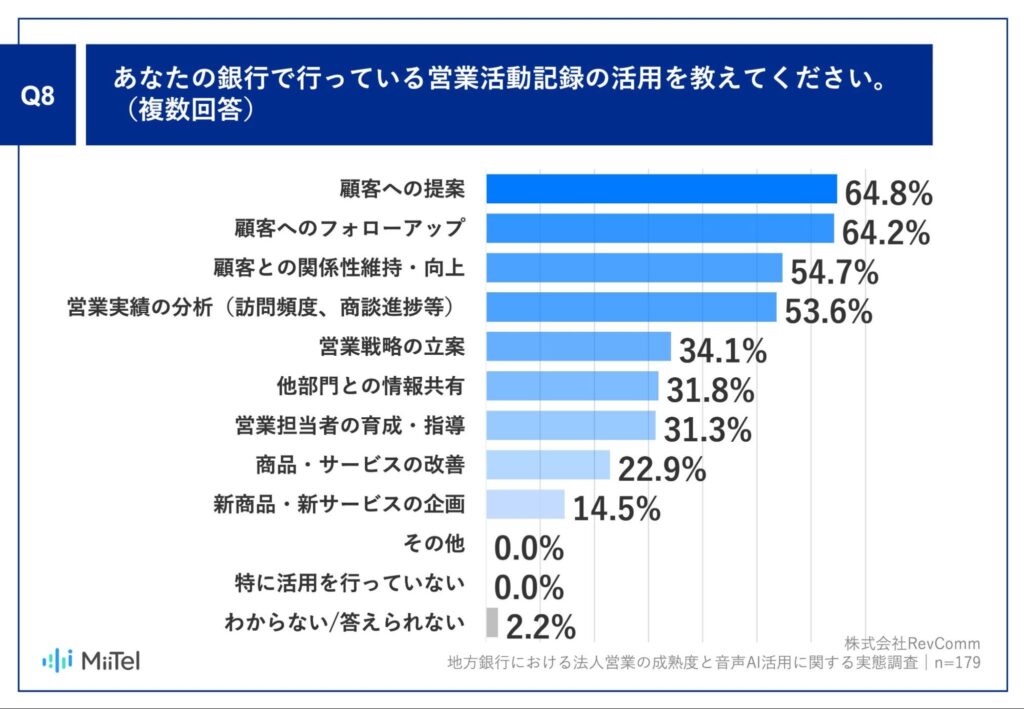 「あなたの銀行で行っている営業活動記録の活用を教えてください。」という質問に対し、「顧客への提案」が64.8%、「顧客へのフォローアップ」が64.2%、「顧客との関係性維持・向上」が54.7%という回答となりました。