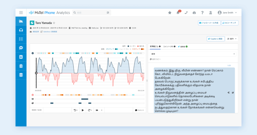 電話解析AI「MiiTel Phone」での文字起こしイメージ