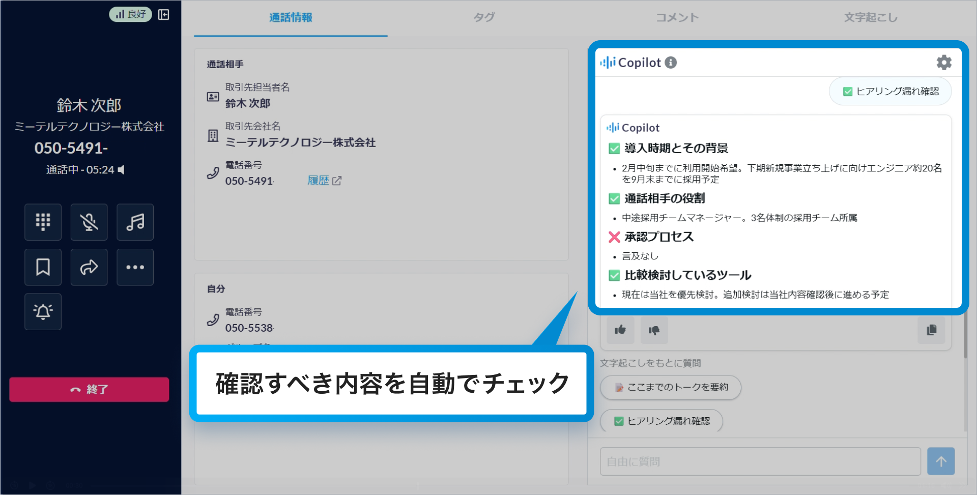 ・通話中の「判断」をアシスト:会話内容をAIが常時分析し、確認すべき事項の抜け漏れをその場で検知・提示。
