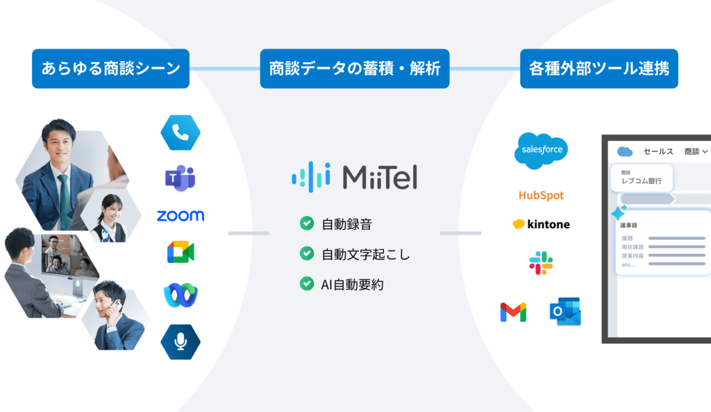 また、対面会話解析AI「MiiTel RecPod」や電話解析AI「MiiTel Phone」と併せて活用することで、ビジネスのすべてのコミュニケーションにおける音声データを蓄積できます。AIビジネスアシスタント「MiiTel Synapse Copilot」により、蓄積した音声データを社内横断データベース化することで、お客様とのコミュニケーションデータを経営資源としてワンストップで活用することができます。迅速な意思決定と的確なアクションに活用することができます。